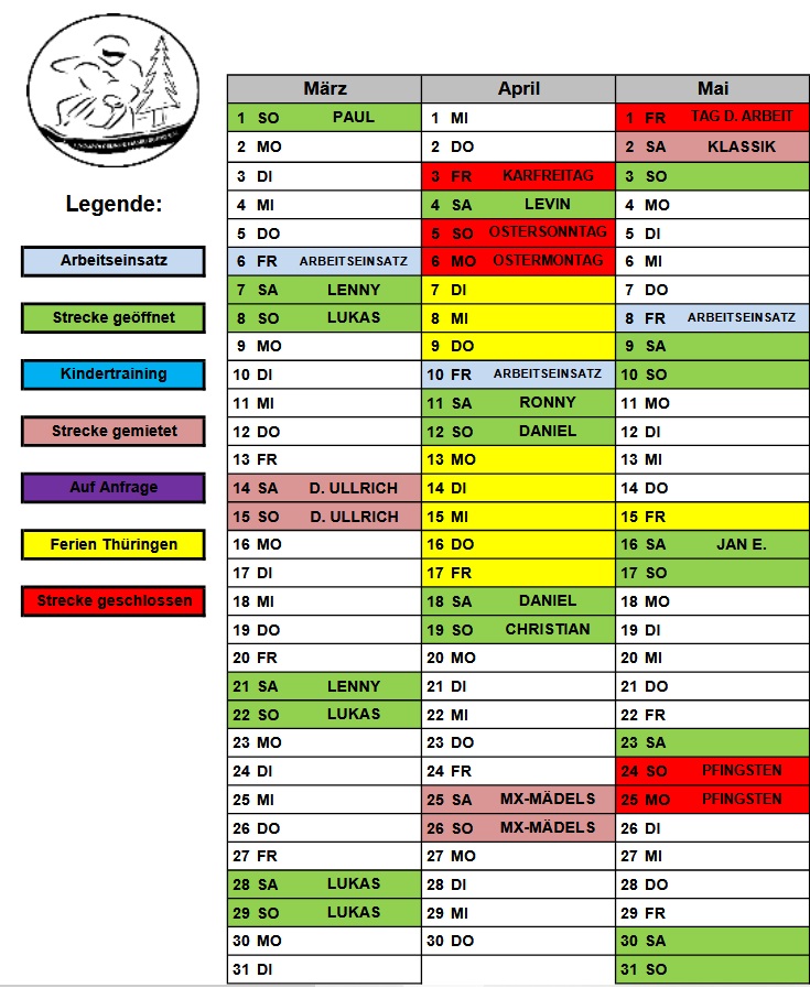 Die Strecke ist an den Grün markierten Tagen wie folgt geöffnet.